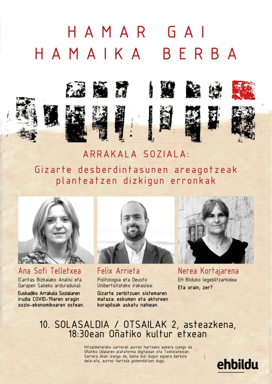 Oraingo honetan hizlariak izango dira Ana Sofi Telletxea (Caritas Bizkaiko Analisi eta Garapen Saileko arduraduna), Felix Arrieta (Politologoa eta Deusto Unibertsitateko irakaslea) eta Nerea Kortajarena (EH Bilduko legebiltzarkidea).