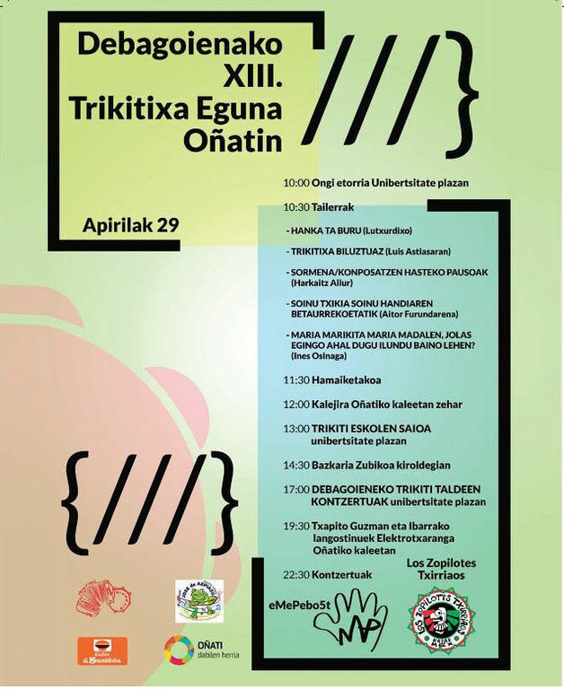 - 17:30ean KONTZERTUAK gazteen taldetxoen eskutik. Herri bakoitzari 20 minutuko tartea lagako zaio, heuren eskoletan dauden "konbo" edo taldetxoek saio bat eman dezaten. Unibertsitate Zaharraren aurrealdean.