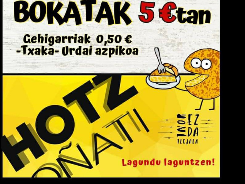 Hotz-Oñati taldeak bokatak eskainiko ditu 5€-tan (gehigarriak 0,50€) Gazteleku inguruan 20:30etik aurrera