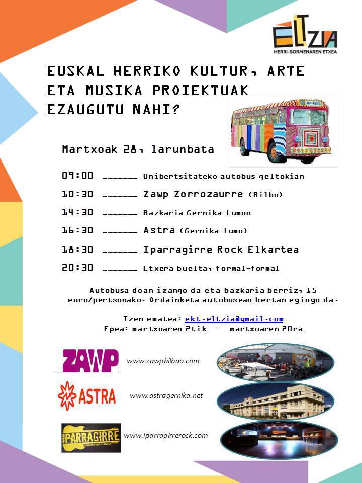 - Eltziak antolatuta Euskal Herriko kultur, arte eta musika proiektuak ezberdinak ezagutzeko . Izen ematea martxoaren 2tik 20ra.