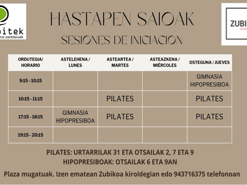 Izen ematean Zubikoa kiroldegian edo 943716375 telefonoan