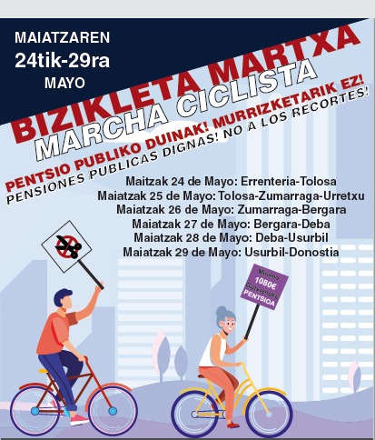 "Gipuzkoako pentsiodunak ekintza bateratuak antolatzen hasi dira berriz ere. Hala, datorren astean (maiatzaren 24tik 29ra) herrialdea zeharkatuko duen bizikleta martxa egingo da Pentsio publiko duinak! Murrizketarik ez! lelopean. Asteazkenean, maiatzak 26, Zumarraga-Bergara etapa egingo du bizikleta martxan, eta Oñatitik igaroko da goizeko 11:00ak aldera. Horregatik, datorren astelehenean ez da egingo Oñatiko plazan egin ohi den elkarretaratzea, eta horren ordez asteazkenean batzeko deia luzatu dute, bizikleta martxari ongi etorria eman eta berarekin bat egiteko. Goizeko 10:30etarako ipini dute hitzordua, Foruen plazan. Bestalde, bizikleta martxari amaiera emanez, larunbatean (maiatzak 29) Donostian (17:00) egingo den manifestazioan parte hartzeko deia luzatu dute Oñatiko pentsiodunek. Autobusa egongo da Oñatitik joan-etorria egiteko, eta izena emateko orriak Arrano eta Olakua tabernetan daude, maiatzaren 26ra arte."