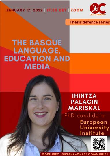 Ihintza Palacin Mariskal Masterraren ikasle ohiak bere doktorego gaiari buruzko aurkezpena egingo du. Euskarari buruzko ikerketa sozio-juridikoa aurkeztuko du; hezkuntzaren eta komunikabideen arloak jorratu ditu Iparraldeko zein Hegoaldeko marko juridikoa aintzat hartuta.