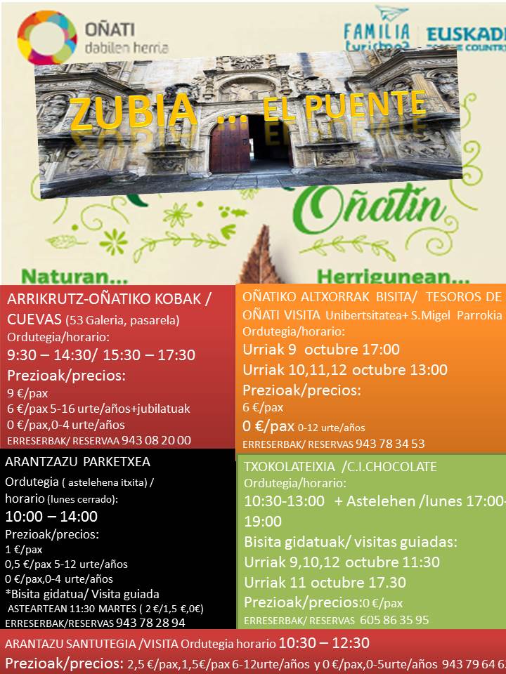 Oñatiko herrigunea zein inguruko natura ezagutzeko aukera zabala urriko zubirako. Bisita gidatuak, Arrikrutz-Oñatiko koban, Aizkorri-Aratz Parketxean, Arantzazuko Santutegian, Oñatiko hirigune historikoan eta Txokolateixian.